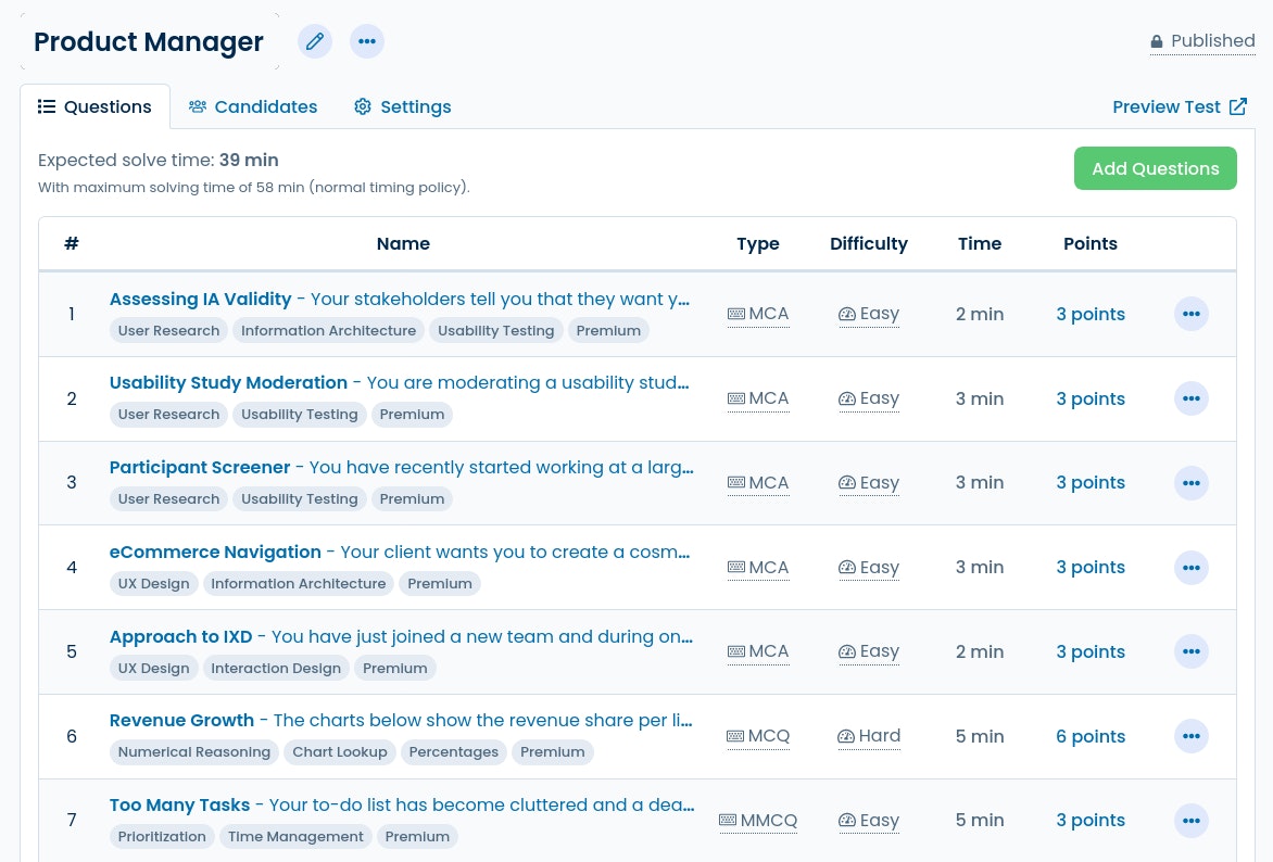 At Scalingo we use Testdome to host our screening tests. It has a huge collection of questions for may different positions.