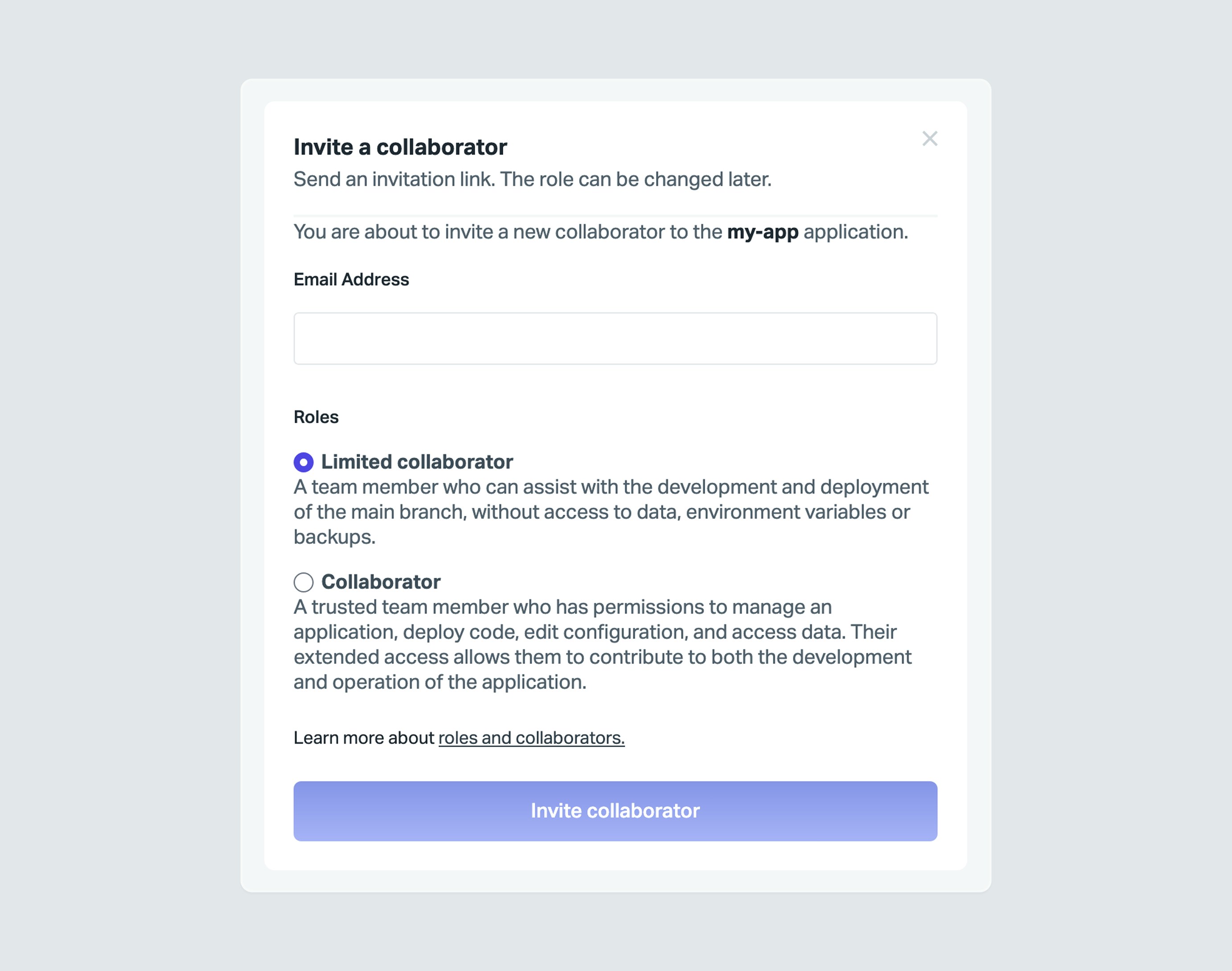 Upto now, inviting someone to collaborate on an application granted them almost the same level of access as the application owner, including deployment, configuration, log access, and the ability to manage other users, secrets, and data.