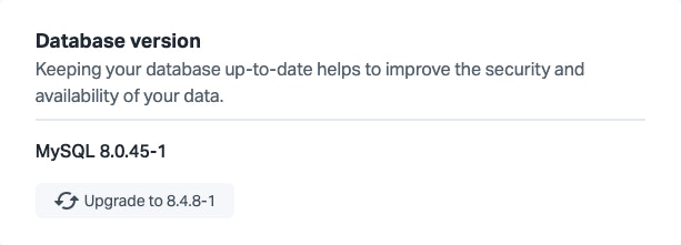 Before upgrading to MySQL 8.4 LTS, the dashboard will first prompt you to upgrade your database to the latest MySQL 8.0 patch release. This ensures a smooth and supported upgrade path.