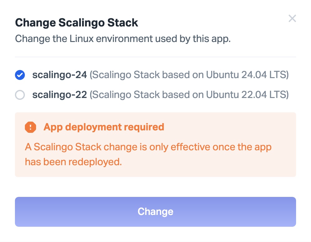 Our newer stack, scalingo-24 based on Ubuntu 24.04 (noble) is available from today on our platform. It is not yet the default one but it will be from the 8th of December 2025 for all new applications. Note that all buildpacks officially supported by Scalingo are compatible with this new stack.
