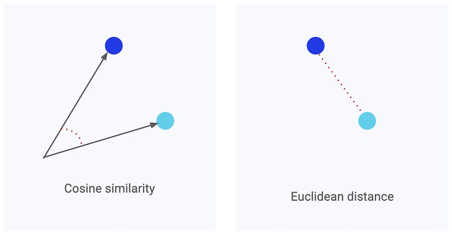 --> While cosine similarity measures the angle between two vectors (great for comparing meaning), while Euclidean distance measures the straight-line distance between them (useful for spatial or numerical data). Both help your database understand which items are most alike, just from slightly different perspectives.