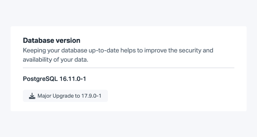 Launch the upgrade in one click. From your database dashboard, simply click the “Major Upgrade” button. We take care of the rest, with no manual intervention required on your side.