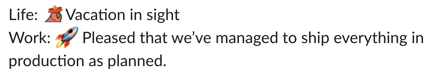WSM are used to share our current mood and the tasks we are working on. This ritual is also used to share the week's schedule or the weekend's schedule, at work and in our personal lives, if we wish.