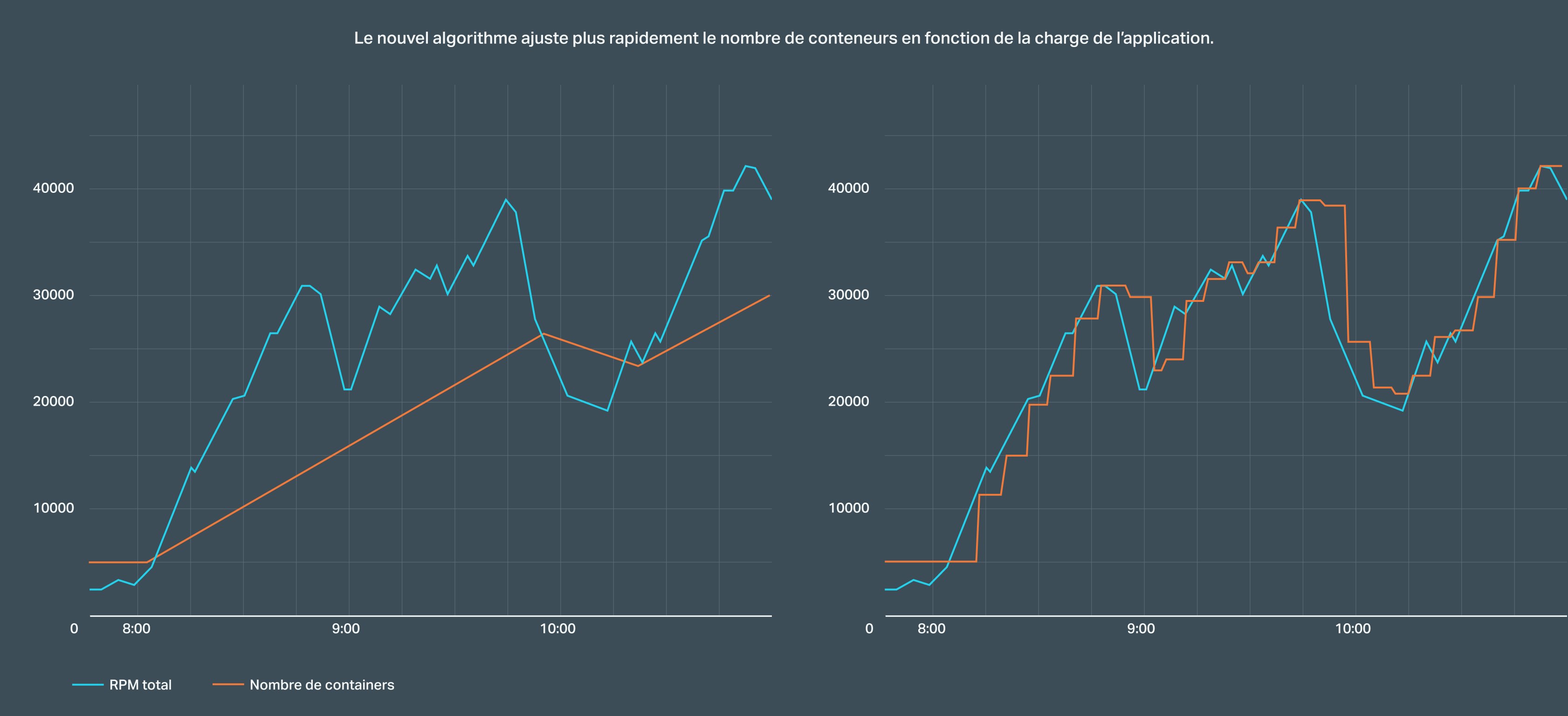 Notre algorithme amélioré permet de réagir efficacement aux variations de charge en ajoutant ou retirant plusieurs conteneurs simultanément, évitant ainsi des ajustements trop lents ou insuffisants. Cela garantit une réponse rapide aux montées en charge soudaines tout en maintenant un coût optimal.