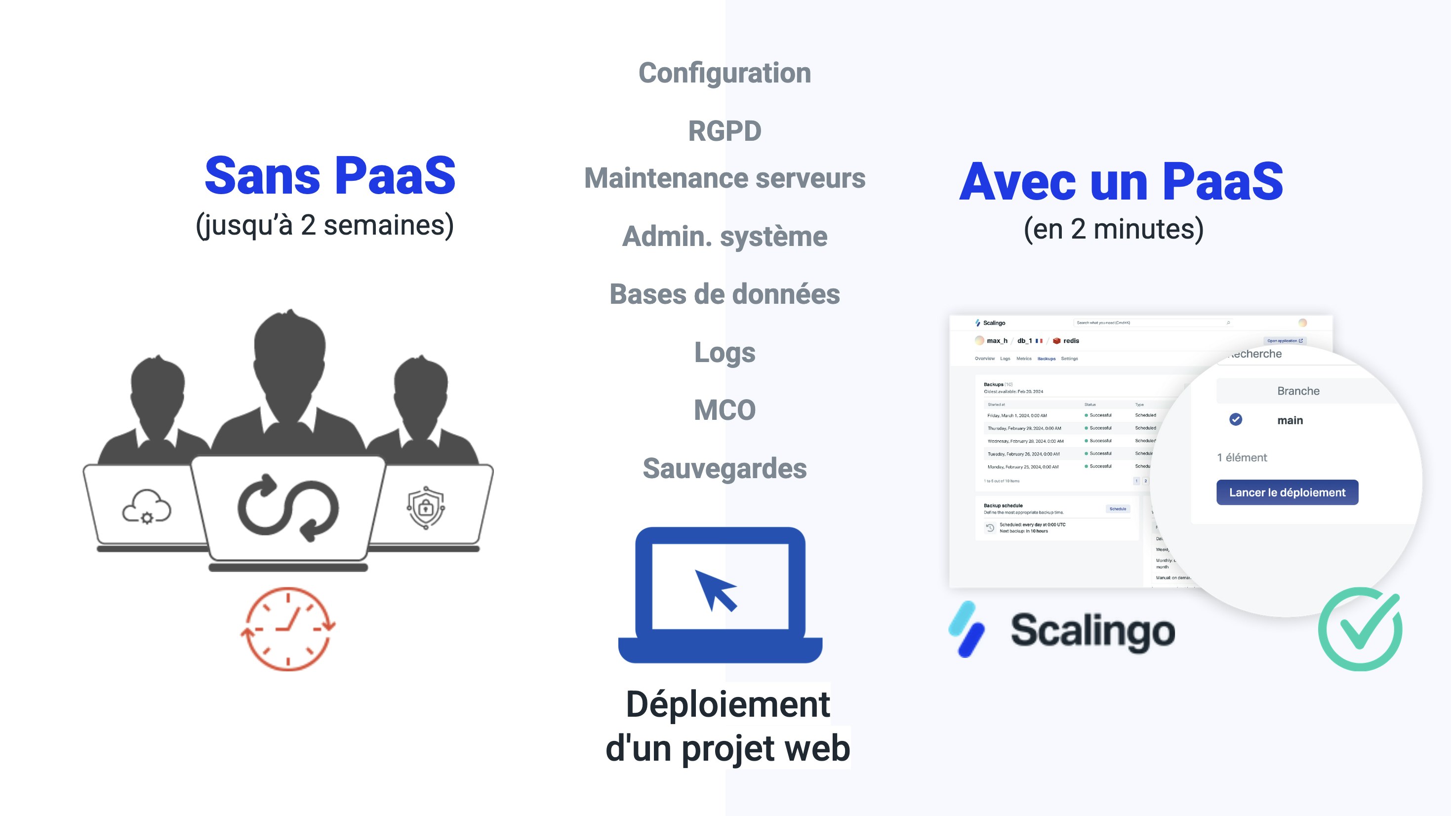 9troisquarts, l’une des agences web qui utilisent Scalingo, nous avait souligné ce gain de temps dans leur témoignage : lorsqu’ils utilisaient des VPS, il leur fallait en moyenne plus de deux jours de travail pour leur configuration. En utilisant un PaaS comme Scalingo, il leur suffit désormais d’une dizaine de minutes pour mettre en place le setup propice au déploiement. Et une fois celui-ci configuré, il suffit de quelques clics pour que le projet soit mis en ligne.
