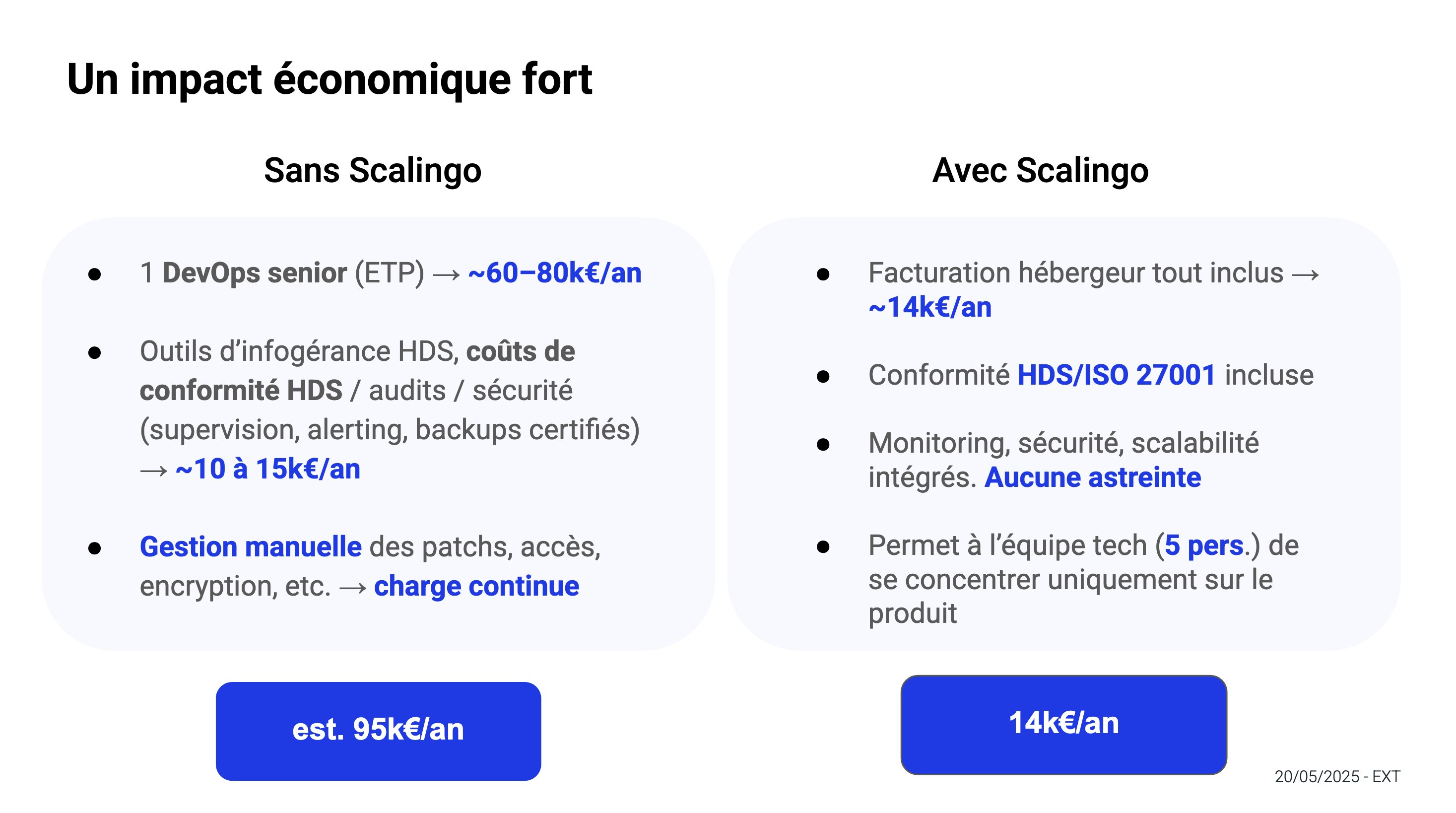 L’un de nos clients, Heloa, a cherché à estimer les économies qu’ils réalisaient sur un an en utilisant Scalingo, en comparant le prix de l’utilisation de la plateforme avec les coûts qu’ils devraient engendrer s’ils décidaient de prendre en charge la gestion de l’infrastructure. Comme visible dans le comparatif ci-dessous, les économies en utilisant un PaaS peuvent être rapidement significatives.