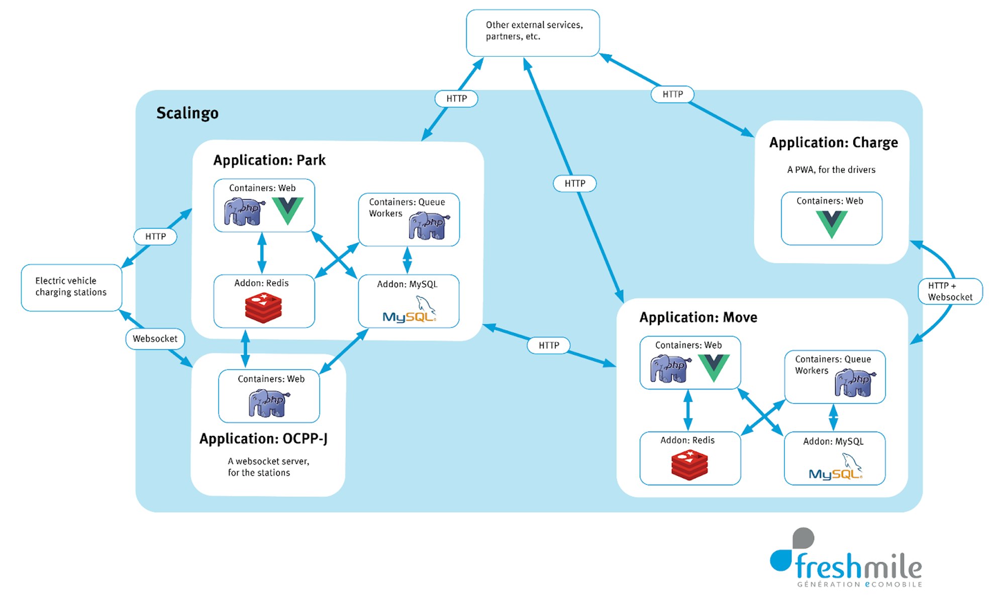 Freshmile héberge au total 18 applications de production et de staging sur Scalingo. Parmi ces applications, la majorité sont des applications de production, dont 3 sont les principales applications de backend : Park, Move et OCPP-J sur le diagramme suivant.