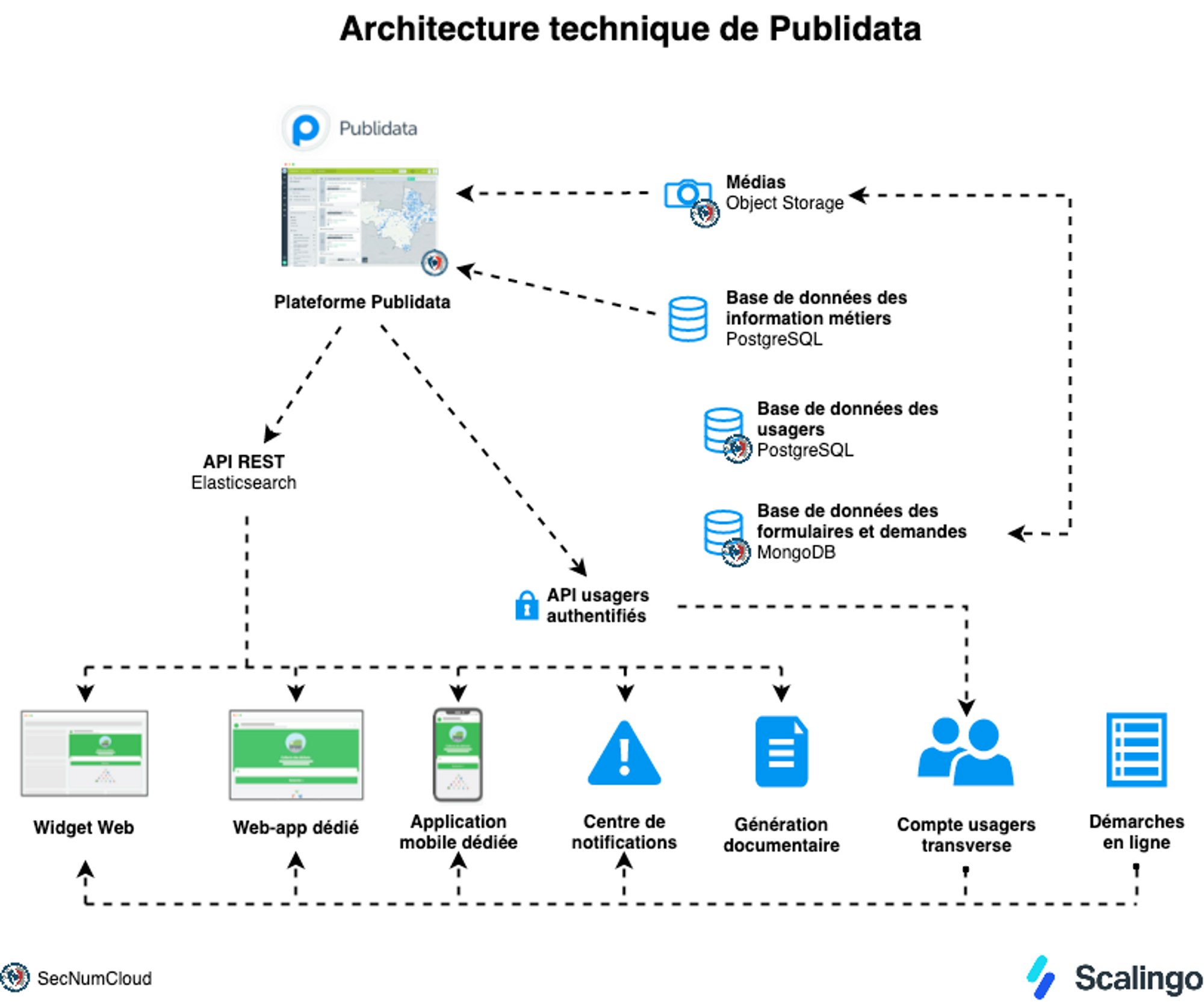 En parallèle, Publidata dispose d’une API REST (Representational State Transfer Application Program Interface) en Elasticsearch qui va permettre l’interaction entres les différentes applications des widgets web, des web-app, de l’application mobile, des centres de notification et de la génération de documents.