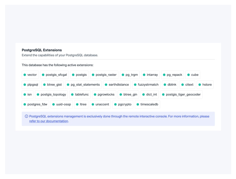 | Extensions (PostGIS, pgvector, citext, etc) | ||
